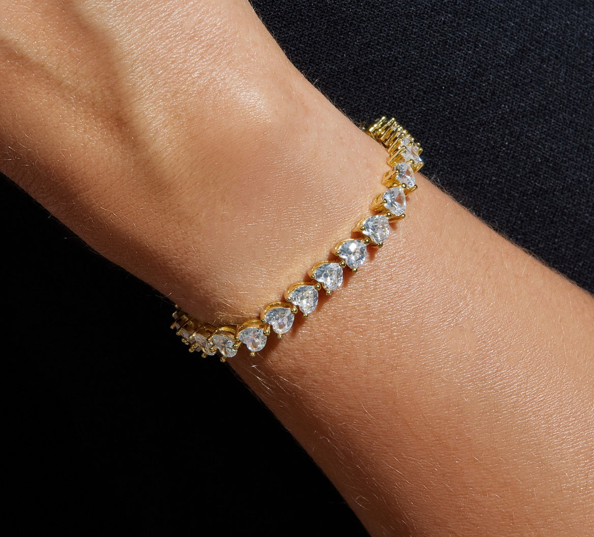The Amour Gold Bracelet is a statement piece that can be worn as a stack or alone. Its glistening shine provides a simulated diamond effect, with its cubic zirconia stones.